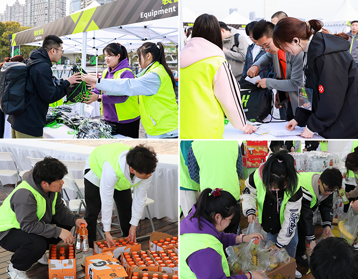 下午15:00,到达比赛现场后,志愿者们开始了活动前期的准备工作,为参赛选手们补给食品套装、布置活动场地,给嘉宾休息室搬添物资、布置队旗等。根据服务内容,志愿者们被分配至九个不同岗位,巡场、检录区、装备领取处、存包更衣区、VIP休息区、嘉年华区、准备区、赛道边各出入口、准备运动员出口区、能量补给区,随处可见绿色马甲的忙碌的身影,他们相互配合,用热情的志愿服务态度全力做好赛事的服务保障工作。