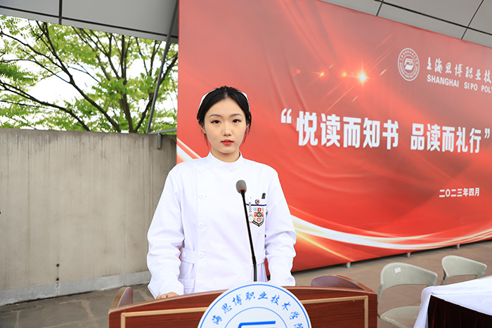 学生代表护理2103班葛欣怡同学作主题发言《书香如蜜,以书会友》,与同学们分享了自己的读书经验和深刻感悟,号召同学们珍惜时间,在美好的青春岁月,多读书,读好书,把读书当成一种生活态度、一种精神追求、一种境界要求,使一切有益的知识文化入脑入心,融汇到行动中,做到修身慎行。