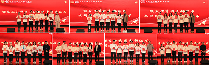 校团委书记、学生处副处长、各二级学院团总支书记依次为获得2022年度“三好学生”“优秀团支部代表”“优秀共青团员”“优秀团学干部”“优秀志愿者”“优秀团支部”“文明班级”“文明宿舍”的集体和个人颁发了荣誉证书。