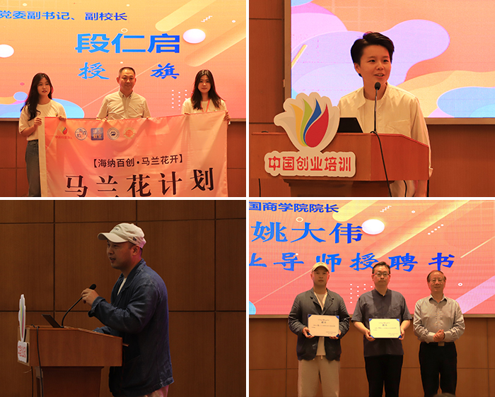 工商外党委副书记段仁启为班级授旗,浦东新区就业促进中心副主任鲍书晨发言,浦东创业yo咖啡创始人叶鹰分享了自身创业历程,姚大伟副校长为培训讲师颁发校外创业导师聘书,我校电商2101班张润喆作学员代表发言。