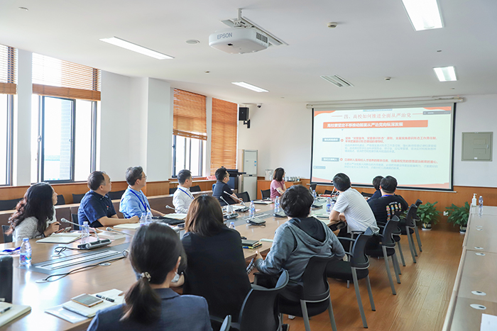 5月26日,学校举行主题教育专题党课暨全面从严治党会议。校领导班子成员、各党总支、支部书记及组织员以线上线下的方式参加会议,党委书记万峰主持会议。