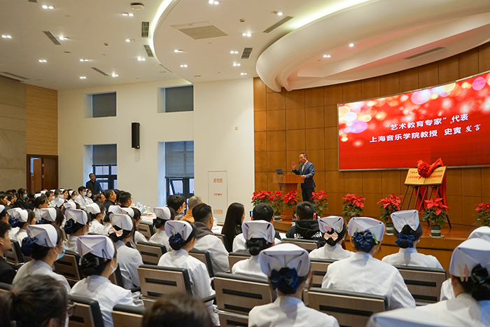 艺术教育专家代表史寅在发言中阐述了艺术带给人类生活的意义和价值,并表示在上海民办高职院校人文艺术教育基地成立之际,作为特聘专家,将继续专注学生人文艺术审美素养教育,为推动高职院校人文艺术素养的培养助力。