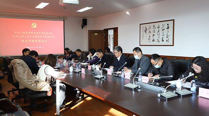为扎实有序做好党委换届选举工作,11月30日,我校与上海工商外国语职业学院联合召开党委换届考察部署会议,上海市民办高校党工委副书记江鸿波等考察组成员出席会议,党委书记万峰、校长皋玉蒂、上海工商外国语职业学院党委书记李月松等两校党委班子成员参加会议。