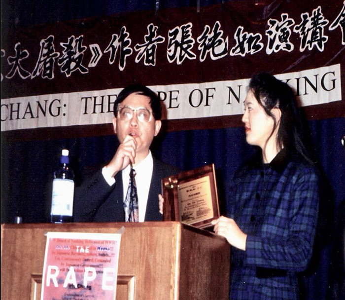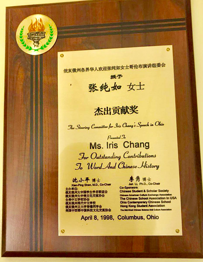 1998年4月8日,沈小平颁发“杰出贡献奖”给张纯如女士