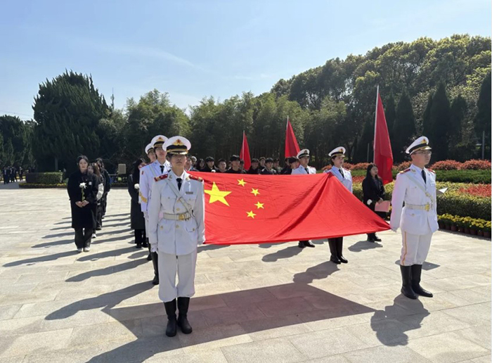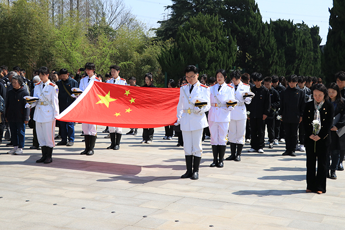 烈士陵园内丰碑屹然挺立,鲜花簇拥。在庄严肃穆的革命烈士纪念碑前,全体人员整齐列队,进行了庄重的祭扫仪式。奏唱国歌后,每个人都怀着对保家卫国的革命烈士的敬意,由学生代表向他们敬献花篮。当国际歌响起,集体默哀三分钟,表达对革命先烈的深切缅怀。