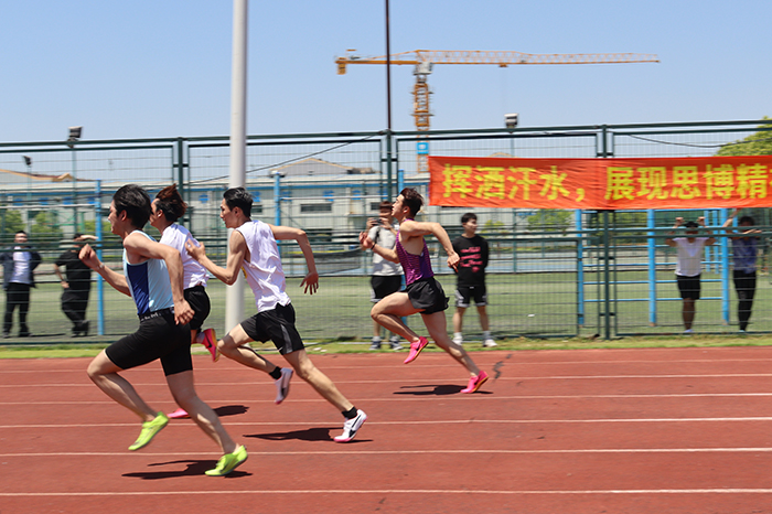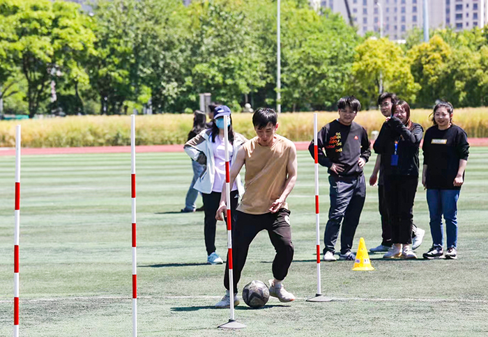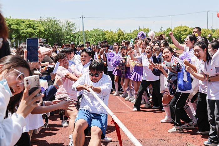 啦啦操比赛结束,运动会比赛正式开始。各项运动项目中,健儿们奋力拼搏,挑战自我,汗流浃背、咬牙坚持,超越对手、互相协作,逐梦赛场,整个运动场上高潮迭起,精彩纷呈。作为观众的同学为自己的学院当啦啦队,热烈地为运动员们加油助威。运动健儿奋勇争先的场景和观众的欢声笑语交织成一幅美丽的画卷。团体拔河、飞镖、足球绕杆射门、1分钟踢毽子……趣味比赛中,师生们欢乐竞技,放松心情,共享运动的快乐与魅力。