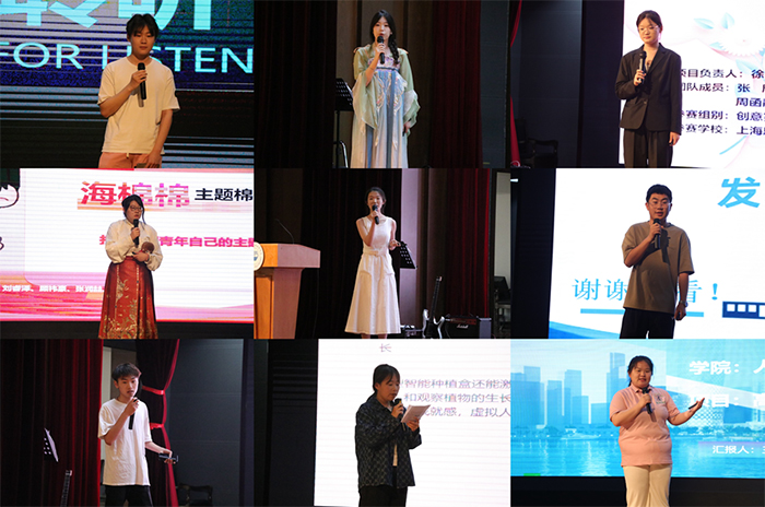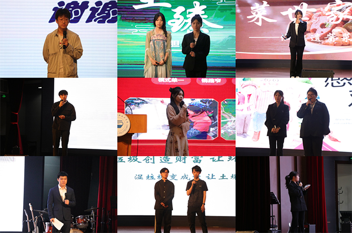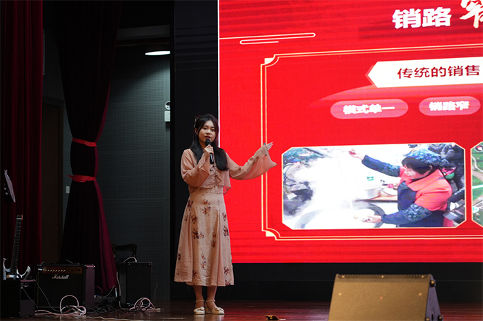 决赛路演现场,来自各院系的21支参赛团队项目负责人需在5分钟时间内完成项目概述、市场分析、商业模式、创新亮点、未来规划等内容介绍,并在后续的3分钟与评委互动交流。
