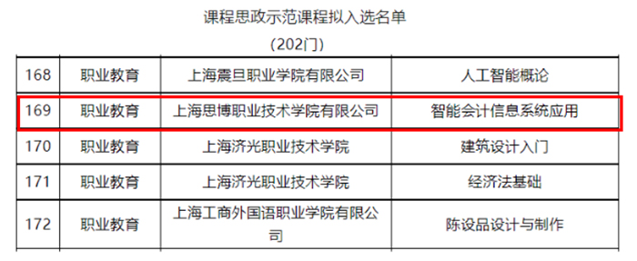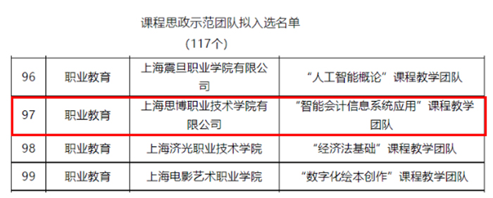 近日,上海市教育委员会发布了《关于2023年度上海学校课程思政示范课程、教学名师和示范团队名单的公示》。我校国商学院会计教研室申报的《智能会计信息系统应用》课程入选上海市级课程思政示范课程,大数据与会计专业教学团队入选为上海市课程思政示范团队。