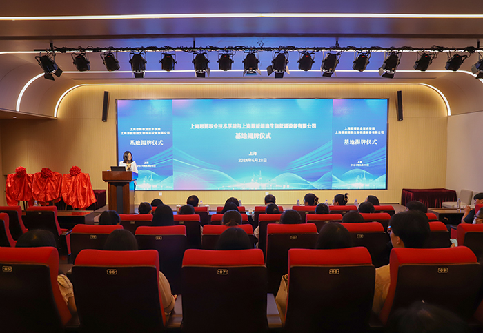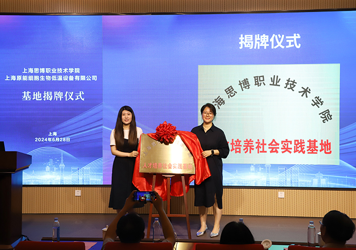 揭牌环节,杨卉卉总监分别与张学龙副校长、刘毅院长和吕梦思副院长为“上海原能细胞生物低温设备有限公司人才培养基地”“上海思博职业技术学院人才培养社会实践基地”“上海思博职业技术学院创新创业实践基地”揭牌。