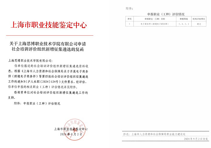近日,上海市职业技能鉴定中心公布第四批职业技能社会培训新增社会评价组织评价项目。我校申报的“电子商务师(跨境电子商务师)”社会化评价机构正式获批。