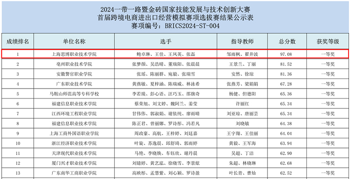 2024年一带一路暨金砖国家技能发展与技术创新大赛首届跨境电商进出口经营模拟赛项在9月28如期举办,历时6个小时的激烈角逐,在邹雨枫、翟井波老师带领下,我校团队荣获金砖国家跨境电商竞赛初赛全国高职组第一名,将晋级11月的全国决赛! 由跨境电子商务专业2201班王佳;关务与外贸服务专业2301班鲍卓琳、张磊、国际商务专业2303班王凤英4名同学组成的参赛1队荣获初赛成绩全国第1名。国际商务专业2303班吴静怡、张婷,电子商务专业2302班季虹、张雪飞4名同学组成的2队选手荣获本次竞赛三等奖。