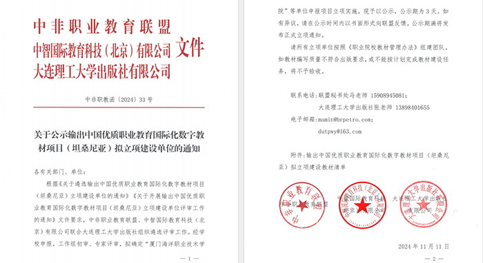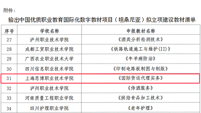 11月11日,中非职业教育联盟发布了《关于公示输出中国优质职业教育国际化数字教材项目(坦桑尼亚)拟立项建设单位的通知》,我校《国际货运代理实务》教材通过申报、评审、答辩环节,成功入选。
