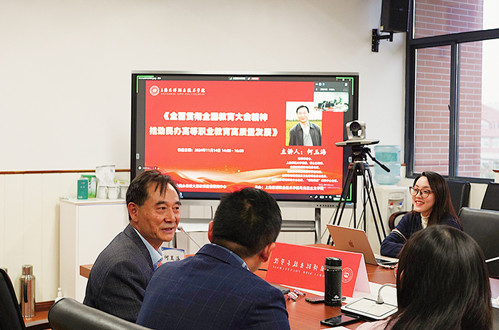 11月14日下午,由上海杉达学院主办,我校马克思主义学院承办的2024年上海民办高校“明理讲坛”活动举行,马院院长何玉海教授作题为“全面贯彻全国教育大会精神,推动民办高等职业教育高质量发展”的专题报告,学校党总支、直属支部书记,基层党支部书记,马克思主义学院教师通过线上线下方式聆听了此次讲座。