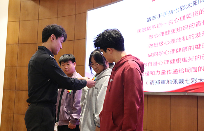 学生处副处长刘志强在仪式中强调了朋辈心理互助的重要性,指出其不仅能帮助同学们解决心理困扰,还能在相互支持中共同成长,对构建和谐校园文化、推动学生全面发展具有重要作用。他鼓励同学们积极参与培训,共同提升学校心理服务能力。随后,同学们在心理中心教师马青的引导下宣誓成为心理健康的守护者,刘志强为学生代表颁发了象征心理健康的太阳花胸针。
