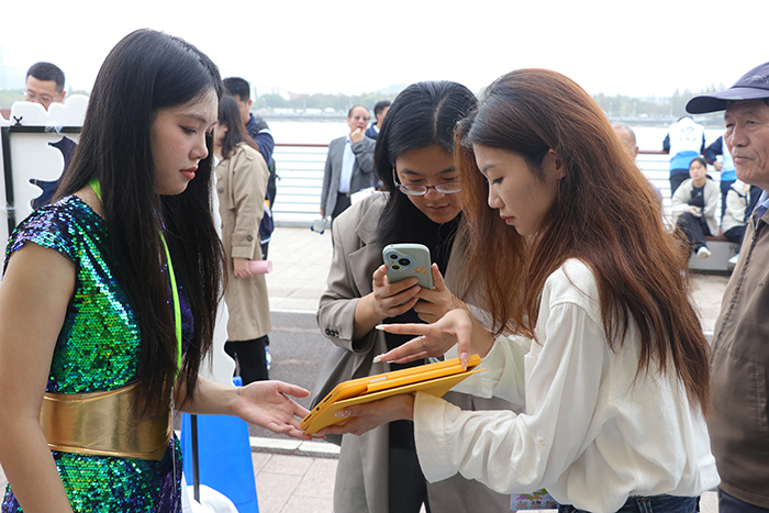 决赛通过集市方式集中展示,参赛学生们通过项目介绍、现场演示和互动问答等方式,与评委和观众进行深入的交流和互动。《鱼骨织梦——“指尖非遗”传承之路》团队热情且自信地向评委们展示他们的项目。该项目以非物质文化遗产鱼骨画为核心,打造了一个线上虚拟现实(VR)展厅。以新技术赋能非遗鱼骨画,使之成为连接过去与未来的文化桥梁,让这一古老艺术在现代社会中焕发新的生机与活力。