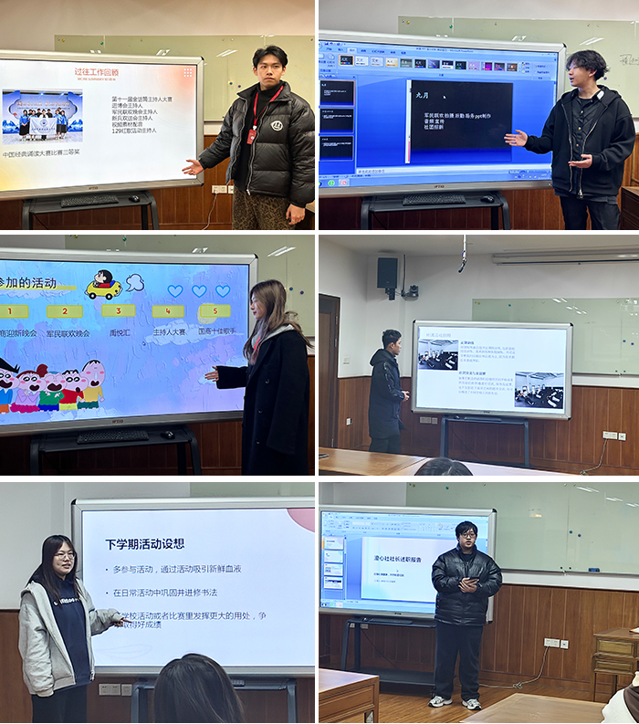 会上,各级学生会组织、学生社团及艺术团负责人依次进行了详细的述职报告。学生会组织负责人从工作成就、理论学习、挑战应对及团队合作等多个角度进行了总结汇报。学生社团、艺术团负责人向大家展示了本年度在常规训练、实际演出及竞赛等方面取得的成果。各组织均阐述了本年度工作的亮点及存在的不足,并明确了下一步工作改进方向。随后,刘志强副处长、眭灵钰书记及团委相关负责人等向学生组织提出建议和意见,并根据上学年的表现和述职情况进行现场评议评测。