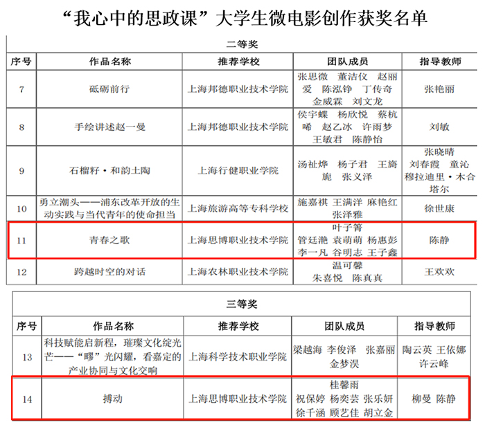 近日,上海高校思政课教指委高职高专分委公布“2024年度上海市高职高专院校大学生讲思政课及微电影创作大赛”评选结果。我校马克思主义学院师生在各项比赛中表现出色,取得了优异成绩。