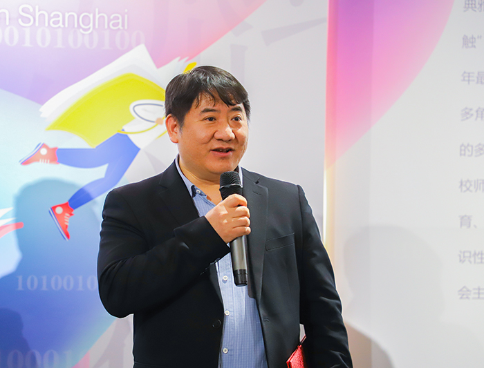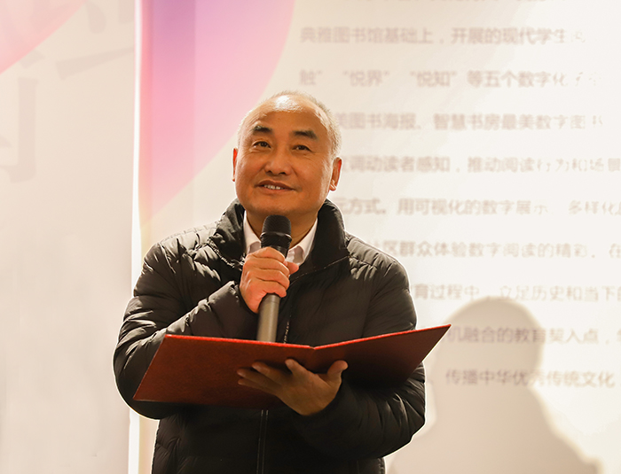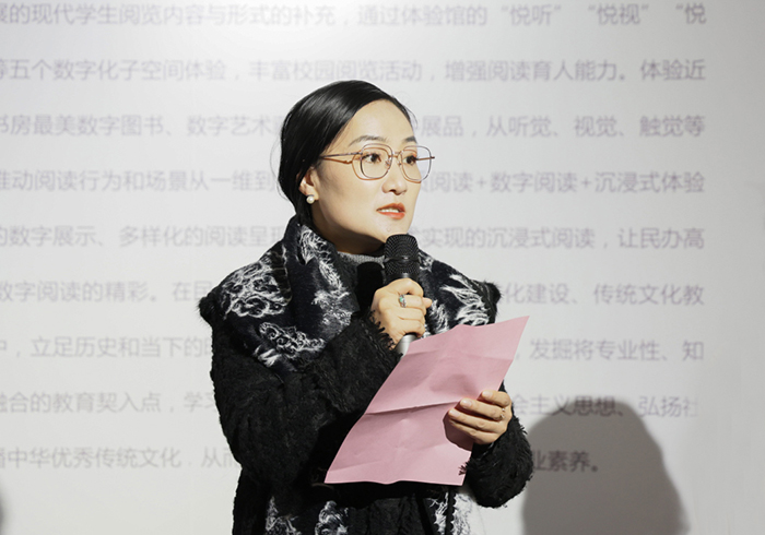 人文艺术馆馆长刘毅介绍了展览筹备概况,分享了背后的故事和付出。本次展览筹备工作从3月开始,获多方支持,致力于打造一个突破传统阅读边界的展览空间。在思博学院海派风格典雅图书馆的基础上,通过“悦听”“悦视”“悦触”“悦界”“悦知”五个空间体验,呈现涵盖2023年沪港书业海报评选获奖作品、全国大学生未来设计师大赛书籍装帧设计获奖作品、上海民办高校学生书籍装帧作品、上海著名藏书票名家精品作品、数字艺术名家作品等共500余件展品,推动阅读从一维到多维,实现从纸质阅读到数字阅读再到沉浸式体验的多元阅读方式转变。