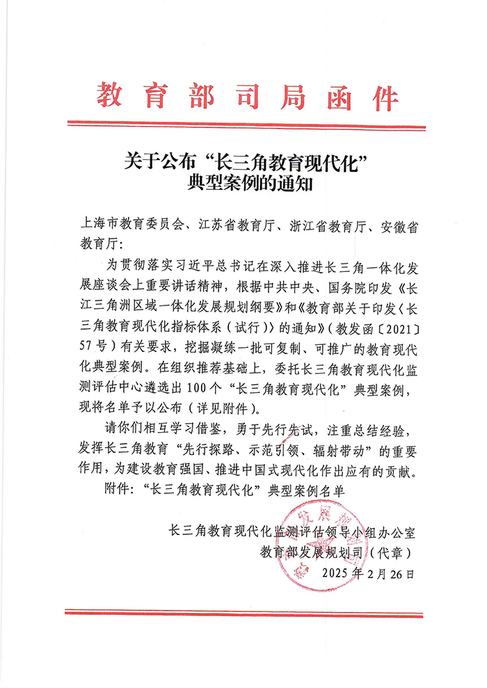 此次案例征集由教育部发展规划司统一部署,共100个案例入选,主要是为了挖掘形成可复制、可推广、可借鉴的长三角教育现代化典型案例,推广先进经验与做法,引导各级各类高校高质量发展。