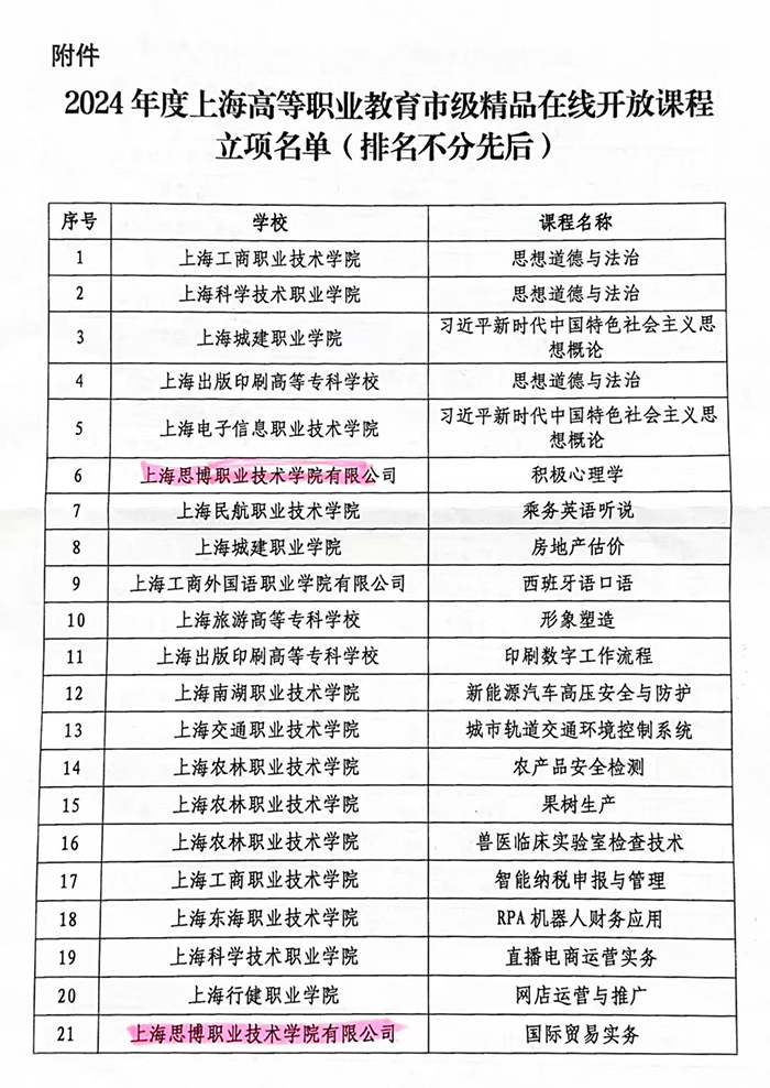 日前,上海市教育委员会印发《关于公布2024年度上海市高等职业教育市级精品在线开放课程立项名单的通知》(沪教委职〔2025〕3号),经学校申报、专家评议和网上公示等程序,我校《积极心理学》《国际贸易实务》和《虚拟现实技术概论》三门课程获批立项建设。