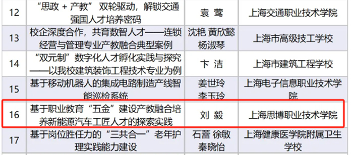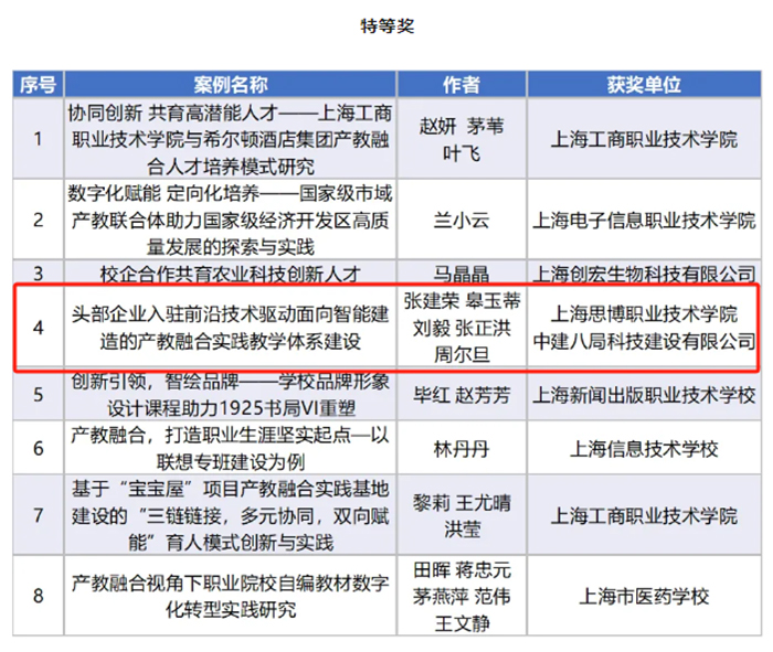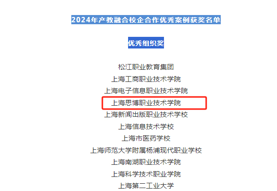 近日,上海市教育委员会教育技术装备中心、上海市发展改革研究院、上海市职业教育产教融合促进会公布了2024年上海(第四届)产教融合校企合作案例大奖评选结果,我校工学院送评的案例《头部企业入驻 前沿技术驱动 面向智能建造的产教融合实践教学体系建设》荣获特等奖、《基于职业教育“五金”建设产教融合培养新能源汽车工匠人才的探索实践》荣获三等奖,学校获评“优秀组织奖”。