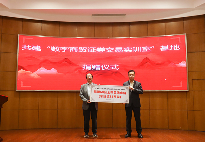 随后,校企双方代表上台签署合作协议,进行捐赠授牌,并为“数字商贸证券交易实训基地”揭牌,标志着双方合作进入了全面深化与升级的新阶段,为双方产教融合建立长期稳定、互利共赢的合作机制奠定了坚实的基础。