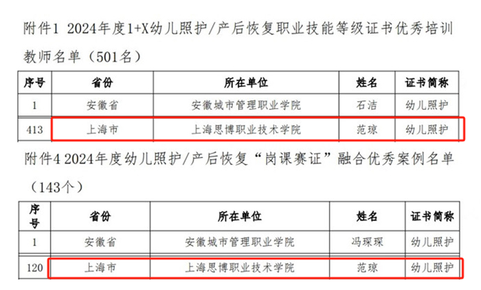 近日,教育部“1+X幼儿照护”职业技能等级证书评价组织——湖南金职伟业母婴护理有限公司发布《关于对2024年度1+X幼儿照护/产后恢复职业技能等级证书试点院校通报表彰的决定》,我校人文与教育学院教师范琼获评2024年度“1+X幼儿照护等级证书优秀培训教师”称号,其撰写的《多维融合,打通课证融通路径——以1+X幼儿照护职业技能等级证书为例》案例获评优秀案例。