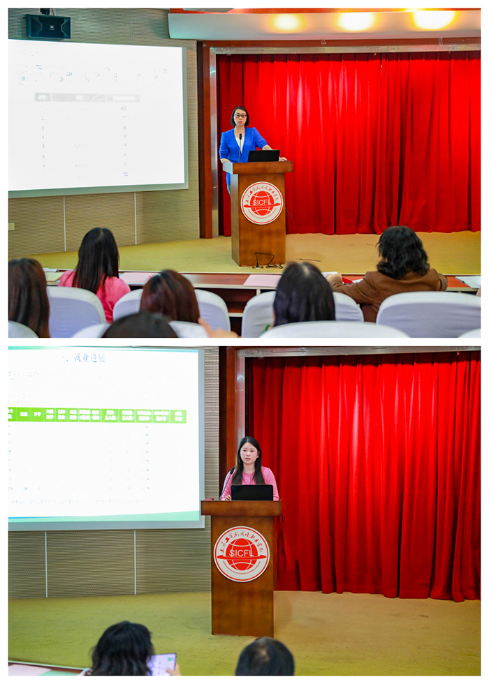 招就处副处长唐池珍、张彬晨分别通报了当前各二级学院毕业生的毕业去向落实情况、访企拓岗、校外实习实训基地开发、供需对接育人项目申报工作、优秀校友案例挖掘、就业困难的重点人群“一生一策”“一生一档”的帮扶等各项工作的落实情况。