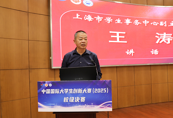 王涛副主任在讲话中高度肯定了两校融合发展成效。他指出,两校在优质教育资源共建共享、跨校区双创导师团队培育、品牌化双创活动等方面已形成鲜明特色,为学子搭建了广阔的创新实践舞台。同时,他也就今年的中国国际大学生创新大赛(2025)的组织工作提出确保参赛数量,力争取得优异成绩,开拓新兴赛道的三点要求。他希望两校以此次赛事为契机,充分发挥两校优势互补的特色,在专业交叉融合中培育创新成果,实现1+1>2的协同效应。最后,王涛副主任预祝两校参赛项目在后续赛事中能再创佳绩,期待更多“上海职业院校项目”亮相中国国际大学生创新大赛,为上海职业教育增光添彩。