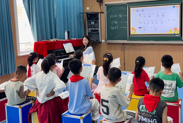 近日,我校人文与教育学院党员教师王艾佳圆满完成浙江省衢州市开化县大溪边乡中心小学乡村支教工作。作为该校唯一的专业音乐教师,王艾佳老师在支教期间承担了1到6年级全学段音乐课教学任务,采用别具一格的“游戏化教学”模式,引导孩子们通过歌唱、舞蹈、游戏和乐器演奏的方式来表达自己,培养学生的音乐兴趣和团队合作精神。