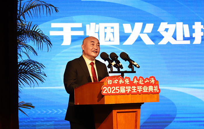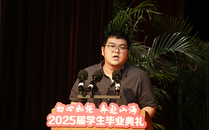 教师代表郑舒文以“毕业是人生新篇起笔”为切入点,回顾学生从“破土春笋”到“振翅鲲鹏”的蜕变,用“穷则独善其身,达则兼济天下”寄语毕业生以能力照亮他人,并以“身体康健、家庭和睦、职场顺遂、忠孝两全”四愿传递师者温情。