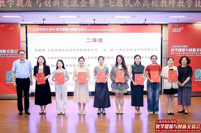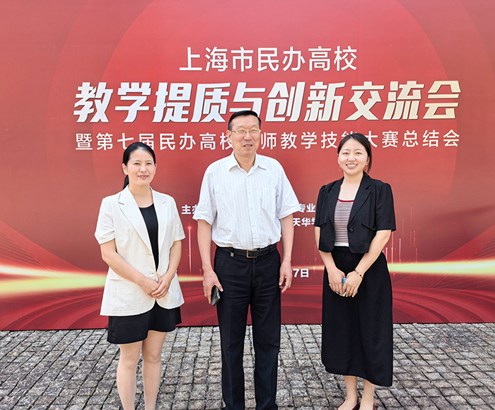 近期,在第七届上海市民办高校教师技能大赛复赛中,我校张娜娜、付童两位老师凭借出色表现,从众多选手中脱颖而出,分别斩获高级组和中级组二等奖。6月27日,两位获奖教师代表学校参加了在天华学院隆重举行的第七届民办高校教师教学技能大赛颁奖典礼。副校长张学龙出席了活动,并与两位获奖教师合影。