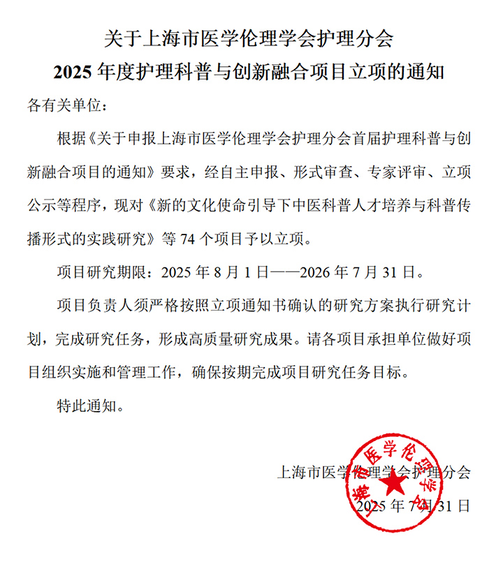 近日,上海市医学伦理学会护理分会下发《关于上海市医学伦理学会护理分会2025年度护理科普与创新融合项目立项的通知》。经自主申报、形式审查、专家评审、立项公示等多环节严格遴选,我校卫生技术与护理学院申报的4项课题成功获批立项。其中,郑翩老师负责的《护理专业学生参与科普短视频创作的自我效能感与传播效果研究》、何云玉老师负责的《基于跨学科融合的老年人数字技能科普传播》获批重点课题立项;刘娟萍老师负责的《慢病无忧、健康同行——老年慢病科普视频创作》、包可婷老师负责的《护理用药科普中分子机制的可视化解析与实践研究》获批一般课题立项。