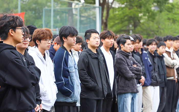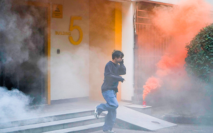 为确保演练科学高效,后保处提前制定详尽演练方案,明确各工作小组职责分工、疏散路线和集结地点。下午3点,随着北区5号宿舍楼内消防警报声响起,消防疏散应急演练正式启动。消防控制中心接到烟感探测器报警信号后,立即启动应急广播与应急预案,同步通知楼内人员紧急疏散。楼内宿管员、辅导员第一时间到位,引导楼内师生们用湿毛巾捂住口鼻,弯腰低姿,沿预定疏散路线快速、有序撤离至中区篮球场指定安全区域。