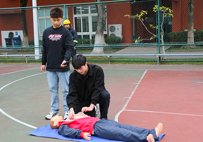 全体师生安全疏散至集结地点后,演练进入第二环节——心肺复苏现场讲解与灭火实操培训。学校平安志愿者团队现场演示心肺复苏急救操作要点,详细讲解灭火器“提、拔、握、压”使用操作步骤。随后,学生代表及物业、食堂员工代表依次参与灭火实操,亲身体验扑灭初起火情的过程,大家纷纷反馈,这种“零距离”实战演练结合系统的理论讲解,更为直观、深刻,真正实现了学以致用。