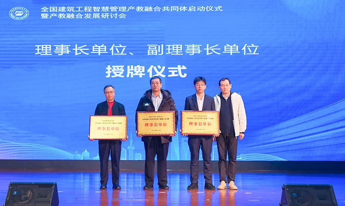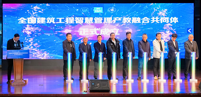 在全场嘉宾的共同见证下,9位领导嘉宾携手按下启动按钮,全国建筑工程智慧管理产教融合共同体正式成立。