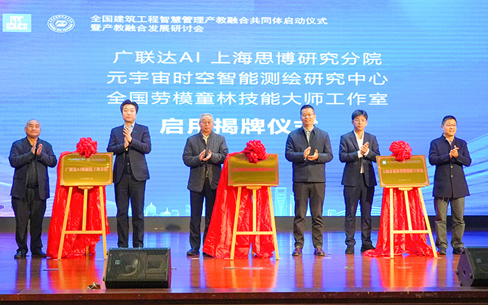 活动现场同步举行产教融合平台揭牌仪式。广联达AI上海思博研究分院、元宇宙时空智能测绘研究中心、全国劳模童林技能大师工作室同步启用,三大平台将聚焦技术研发与人才培养核心需求,为共同体开展实践教学、攻克行业难题提供坚实支撑,推动产教融合成果落地生根。