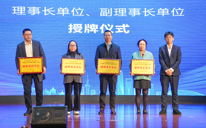 授牌仪式环节,上海市教育委员会教育技术装备中心副主任赵晓伟为三家理事长单位授牌,各理事长单位代表分别为本科、高职、企业类副理事长单位授牌,沉甸甸的牌匾承载着各方深化产教融合、共促产业升级的责任与期许。