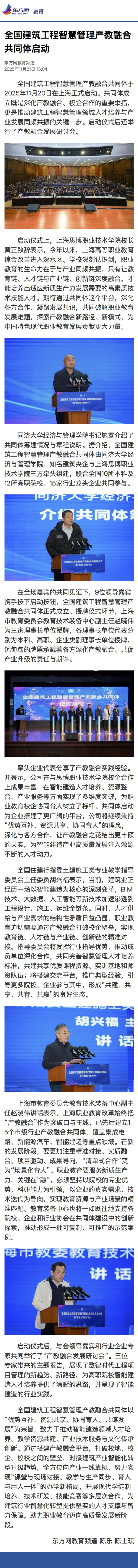 全国建筑工程智慧管理产教融合共同体于2025年11月20日在上海正式启动。共同体成立既是深化产教融合、校企合作的重要举措,更是推动建筑工程智慧管理领域人才培养与产业发展同频共振的关键一步。启动仪式后还举行了产教融合发展研讨会。