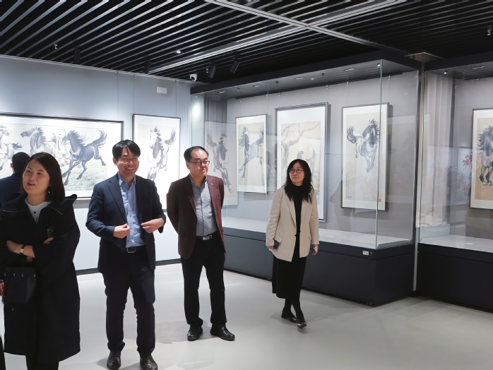 随后,代表团来到我校徐悲鸿艺术展馆参观。馆内珍藏着徐悲鸿大师的众多经典之作,深刻体现了其深厚的艺术造诣与独特的艺术风格。韩方代表在欣赏艺术作品的过程中,也进一步了解到我校对艺术教育的高度重视与大力投入。艺术展馆这一独特的文化育人平台,不仅传承了优秀传统文化,也丰富了学校教育内涵,这种将艺术教育与人才培养深度融合的教育理念与方式,赢得了来宾的一致认可,认为具有借鉴价值。