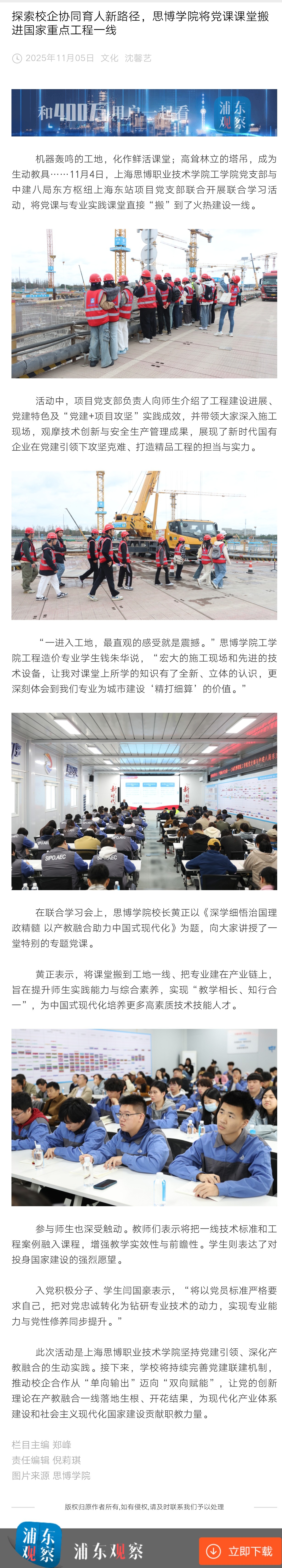 机器轰鸣的工地,化作鲜活课堂;高耸林立的塔吊,成为生动教具……11月4日,上海思博职业技术学院工学院党支部与中建八局东方枢纽上海东站项目党支部联合开展联合学习活动,将党课与专业实践课堂直接“搬”到了火热建设一线。