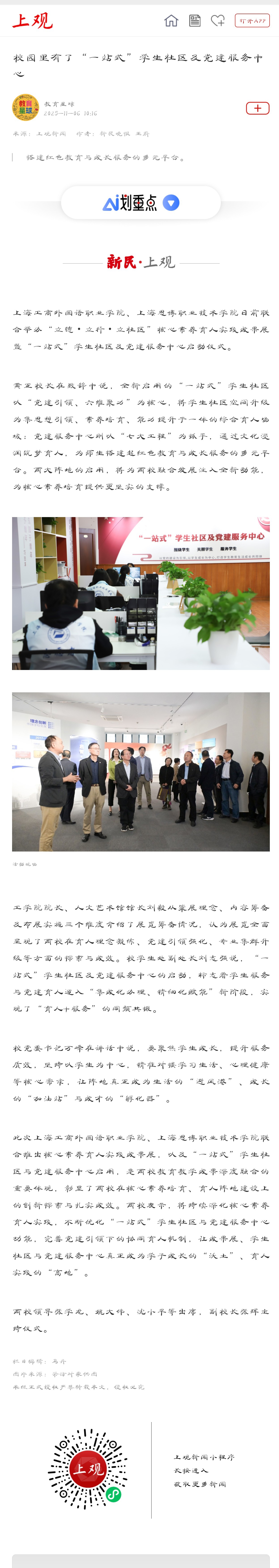 此次上海工商外国语职业学院、上海思博职业技术学院联合推出核心素养育人实践成果展,以及“一站式”学生社区与党建服务中心启用,是两校教育教学成果深度融合的重要体现,彰显了两校在核心素养培育、育人阵地建设上的创新探索与扎实成效。两校表示,将持续深化核心素养育人实践,不断优化“一站式”学生社区与党建服务中心功能,完善党建引领下的协同育人机制,让成果展、学生社区与党建服务中心真正成为学子成长的“沃土”、育人实践的“高地”。