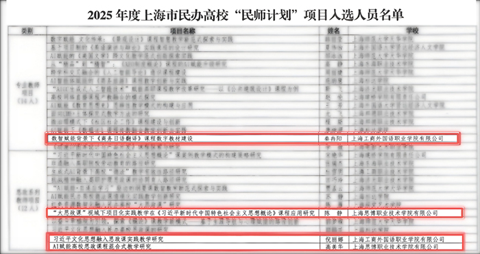 经过精心筹备与激烈角逐,我校多个教师项目成功通过项目遴选。在2025年度“民师计划”项目中,秦冉阳老师成功入选专业教师项目;陈静、倪丽娜、高美华三位老师入选思政系列教师项目;张倩、刘毅两位老师入选管理人员项目。“晨光计划”中,王艾佳、王诗慧两位老师进入拟入选名单。