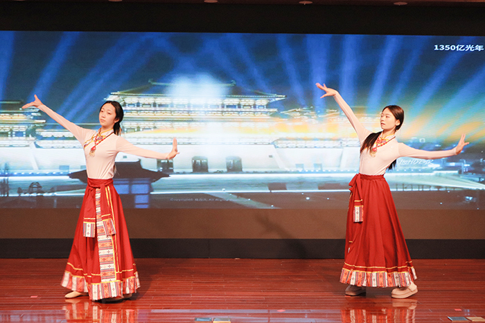 颁奖环节结束后,新闻2402李梦烯和西语2501倪乐带来舞蹈《藏风美少年》。她们以灵动舞姿、飞扬神采,展现出青春的活力与激情,赢得现场师生阵阵喝彩。