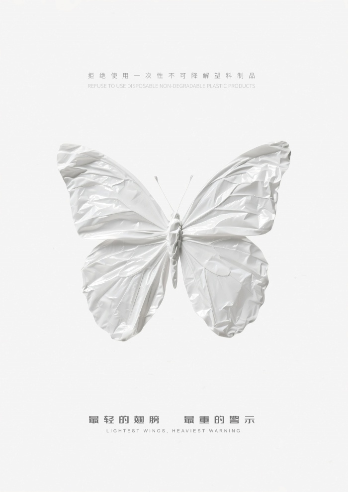 曾健老师的入选作品《最轻最重》凭借独特视觉语言与深刻思考脱颖而出。作品以塑料薄膜塑“蝶翼”,借蝶之轻盈隐喻一次性塑料“轻贱易弃”的特性,又以纯白肃穆质感放大其生态“沉重危害”,这美而违和的蝶,正是自然难消的伤痕。作品精妙把控材质、光影与空间,以视觉冲击唤醒大众环保意识,呼吁拒用不可降解塑料,既蕴含轻重对比的哲学思考,也精准契合大展“创意创新、融合发展”理念,彰显了对当代设计趋势的敏锐把握与传统文化的现代创新表达。